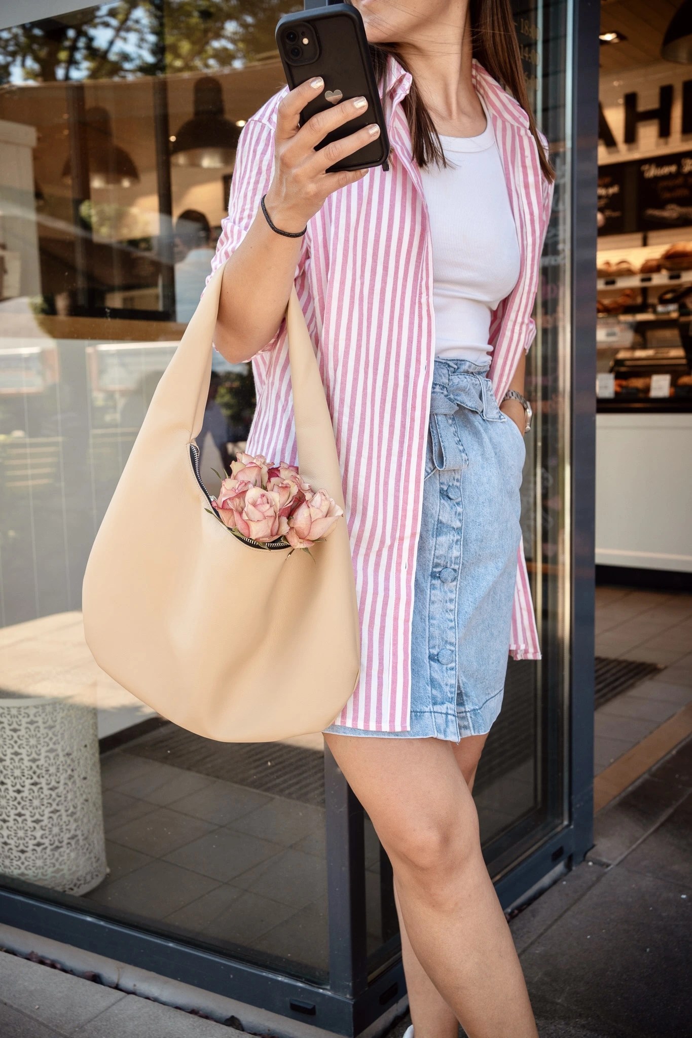 Du trägst sie bequem über der Schulter, während das großzügige Hauptfach all deine Essentials fasst. Ein integriertes Zipperfach sorgt zusätzlich für Ordnung und sicheren Stauraum für kleinere Gegenstände.
