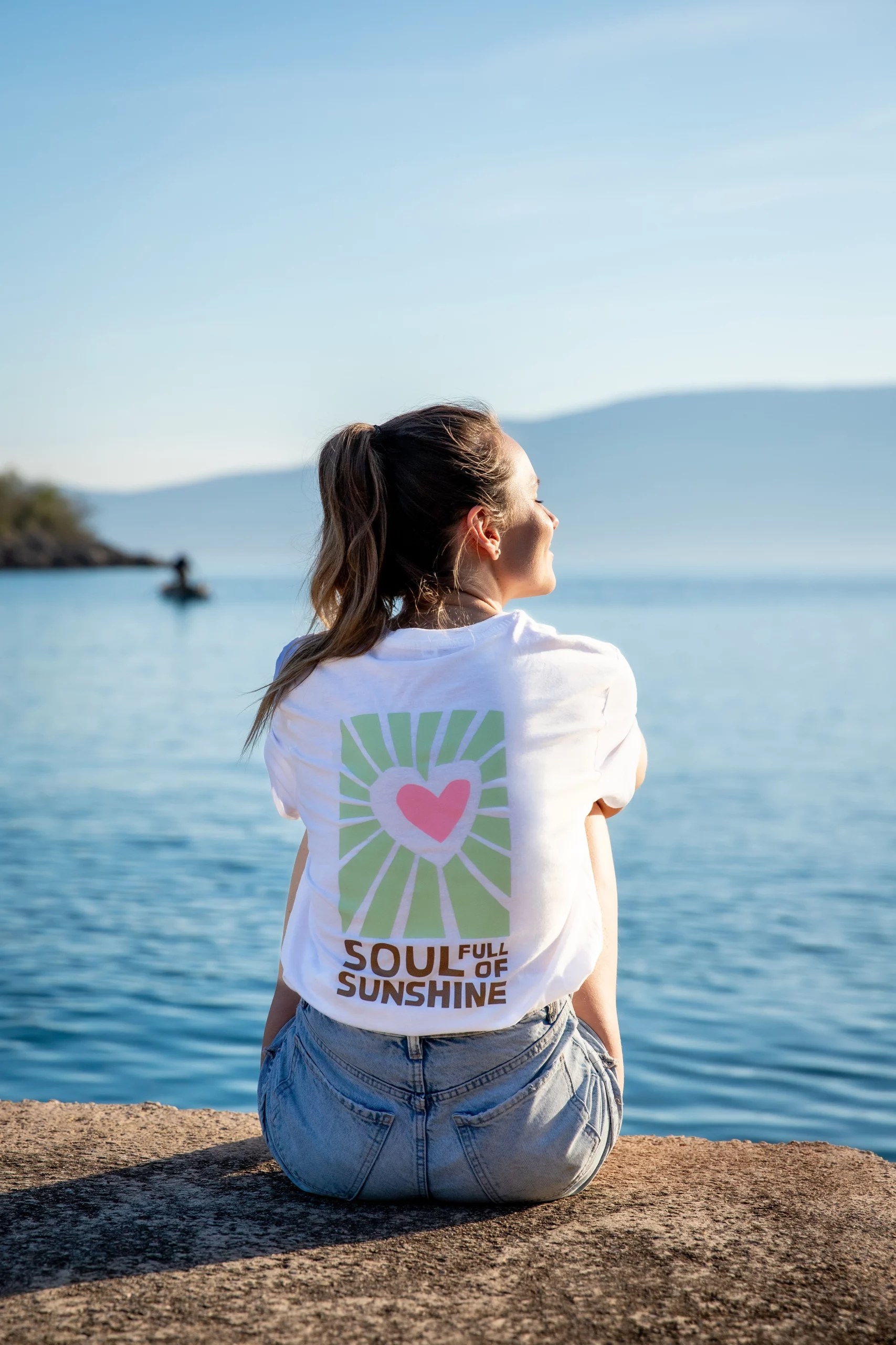 Lässig, stylisch und mit positiver Energie – unser Oversize T-Shirt ist mehr als nur ein Kleidungsstück. Auf dem Rücken strahlt das Design „Soul full of sunshine“ pure Lebensfreude aus, während ein kleines Herz auf der Vorderseite für liebevolle Zurückhaltung sorgt.