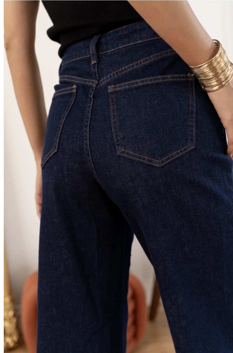Die dunkelblaue Waschung ohne Verwaschungen macht die Jeans zum echten Allrounder: Ob casual oder schick, sie lässt sich vielseitig kombinieren.